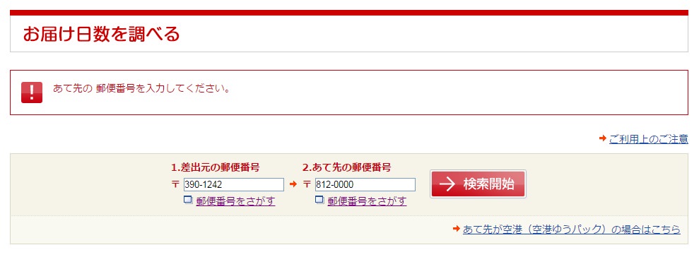 お申し込みの地域によって容器キットや検体の郵送日数は異なります。郵便の場合、日本郵便株式会社Webサイト「お届け日数を調べる」で調べることができます。以下はその調べ方ですので、ご参考ください。