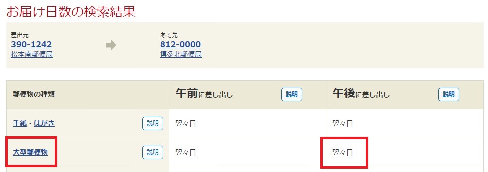 2.「大型郵便物」の「午後に差し出し」の日数をチェック(赤枠)。(検便検査キット、ノロウイルスキットはこの区分です)