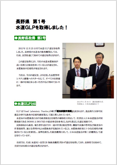 - 長野県第1号水道GLPを取得しました(2012年12月25日)