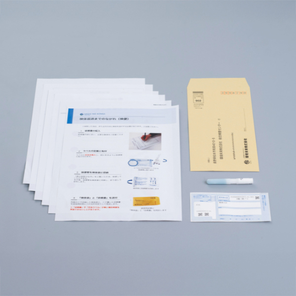 キットには採取容器、依頼書、お振込み案内、返信用封筒、検体用袋が同封されています。郵送事情により通常の郵送所要日数よりも検査キットの到着が遅れる可能性がありますのであらかじめご了承ください。