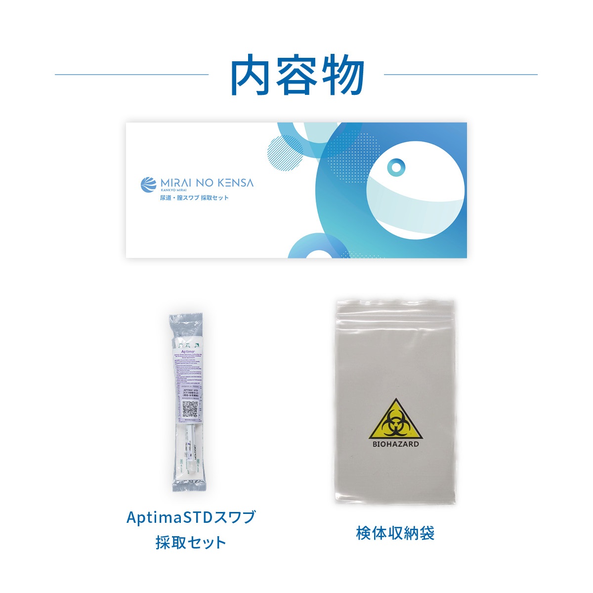 | 採取方法 | スワブ採取タイプ(尿道スワブ/膣スワブ) ※男性は尿道に綿棒(スワブ)を挿入して採取します。 |