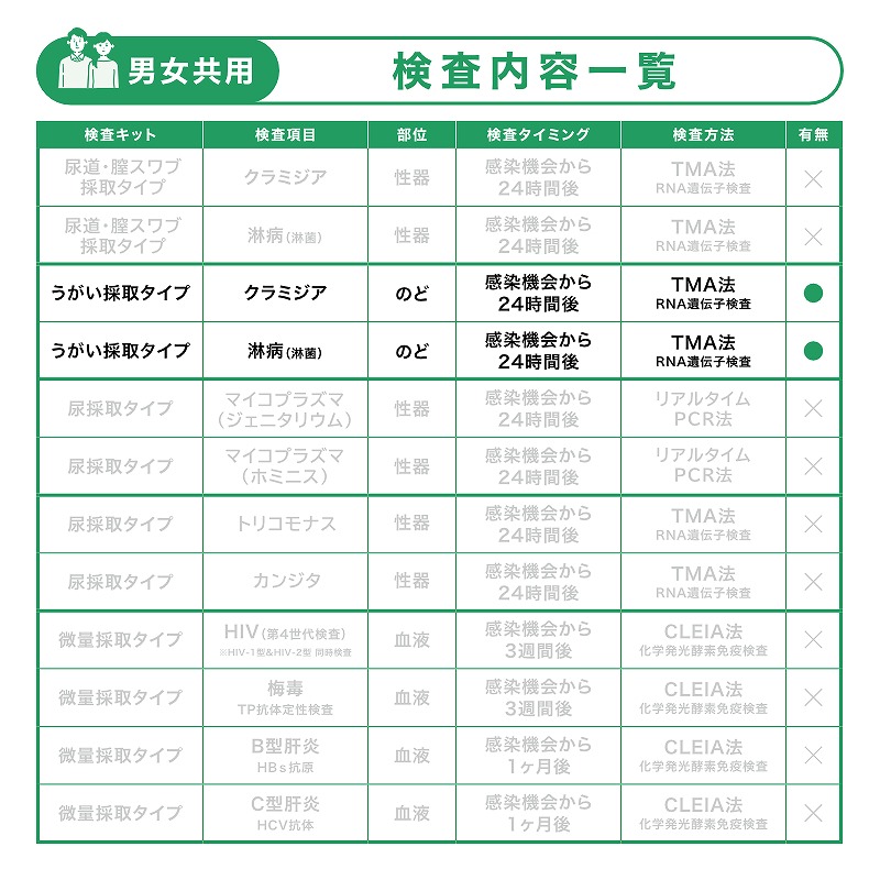 淋菌・クラミジア(のど/性器)に加え、マイコプラズマ、カンジタ、トリコモナス、B型肝炎、C型肝炎、梅毒、HIVなど、感染機会の多い項目を網羅したフルセットです。