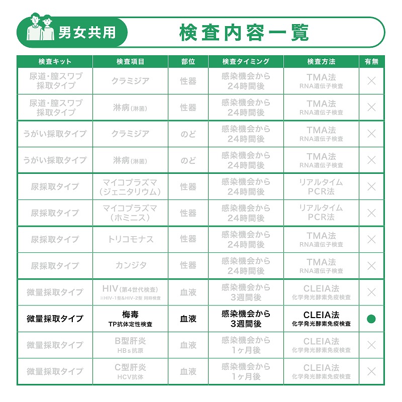 | 梅毒(TP抗体定性検査) | 感染機会から3週間後 | CLEIA法(化学発光酵素免疫測定法) |