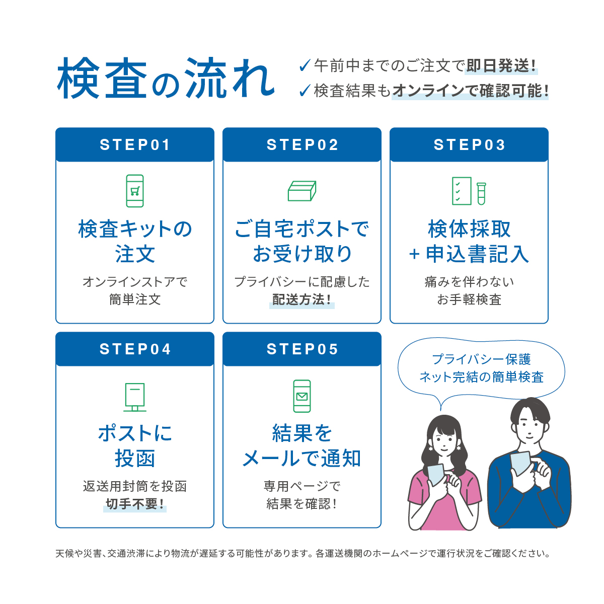 Q. 誰にも知られずに検査できますか?A. はい。品名は「日用品」と表示されます。差出人名は「KM配送センター」となります。
