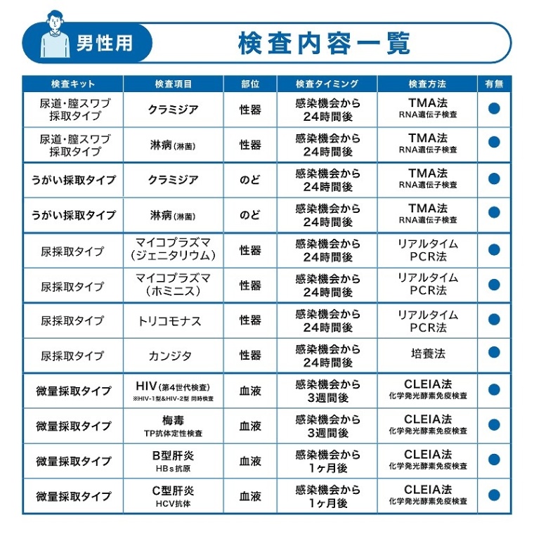 | 検査方法 | クラミジア、淋病(淋菌):TMA法(RNA遺伝子検査) マイコプラズマ(ジェニタリウム・ホミニス)、トリコモナス:リアルタイムPCR法 尿道カンジタ:培養法 HIV、梅毒、C型肝炎、B型肝炎:CLEIA法(化学発光酵素免疫測定法) |