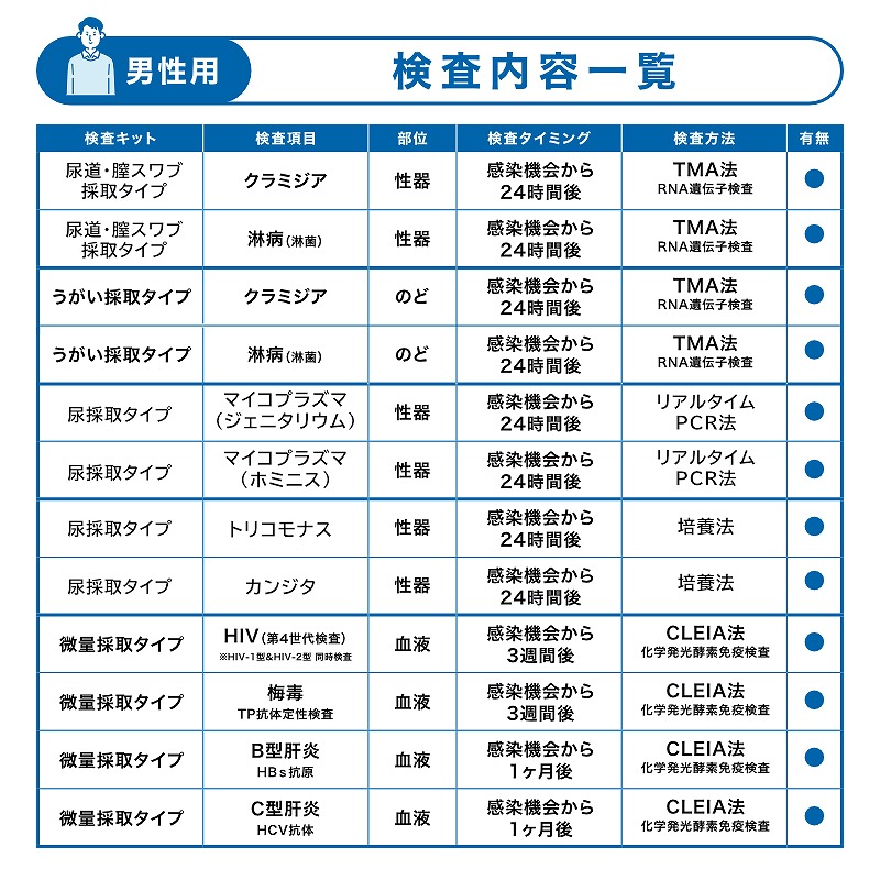| 検査方法 | クラミジア、淋病(淋菌):TMA法(RNA遺伝子検査) マイコプラズマ(ジェニタリウム・ホミニス):リアルタイムPCR法 尿道カンジタ、トリコモナス:培養法 HIV、梅毒、C型肝炎、B型肝炎:CLEIA法(化学発光免疫測定法) |